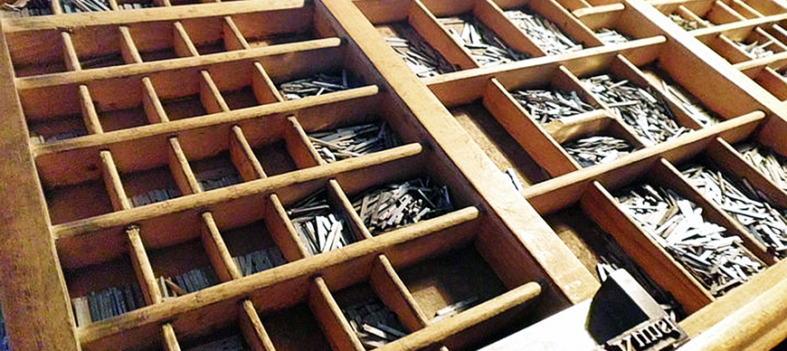 In der Setzerei benden sich mehrere typische Setzer-Gassen mit unzähligen Schriften unterschiedlicher Größen und Epochen. Hier ist der Handsatz mit einzelnen Lettern und Klischées möglich.
